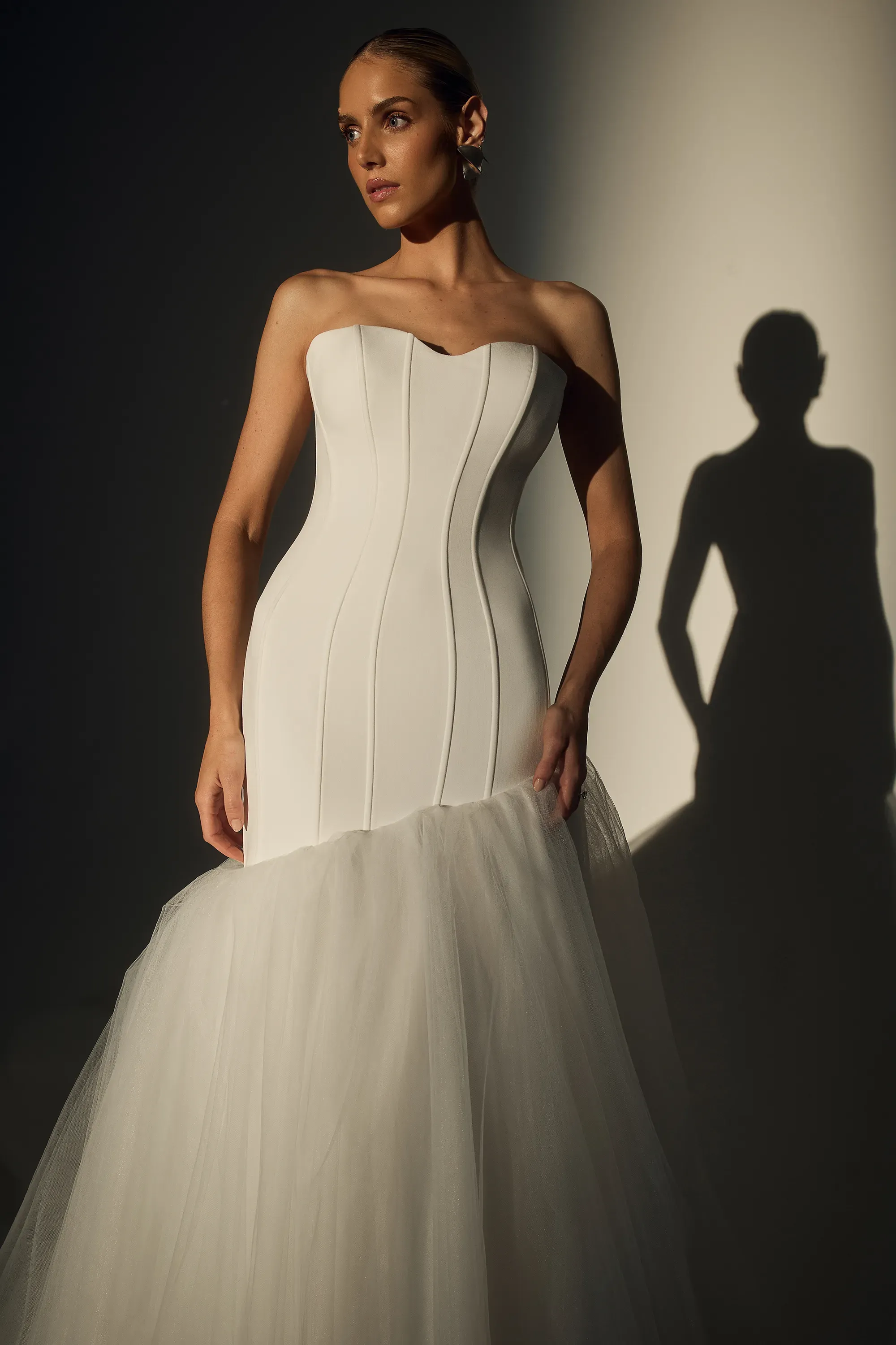 Striking and sculptural, Style LE167 is a mermaid gown designed to celebrate the feminine form with confidence and grace. This strapless silhouette features a classic sweetheart neckline and a fully boned bodice that contours the torso from neckline to hem, offering supportive structure and couture shaping. The princess waistline elongates the frame, flowing seamlessly into a voluminous 76-inch tulle train that adds both softness and dramatic movement. Crafted from Italian Crepe Double Knit with a smooth lining, this gown blends figure-hugging design with timeless elegance, making it a captivating choice for the modern bride seeking romance and refinement. Finished with an invisible back zip closure, LE167 pairs beautifully with a sleek bun and statement studs for a chic, editorial bridal moment.
