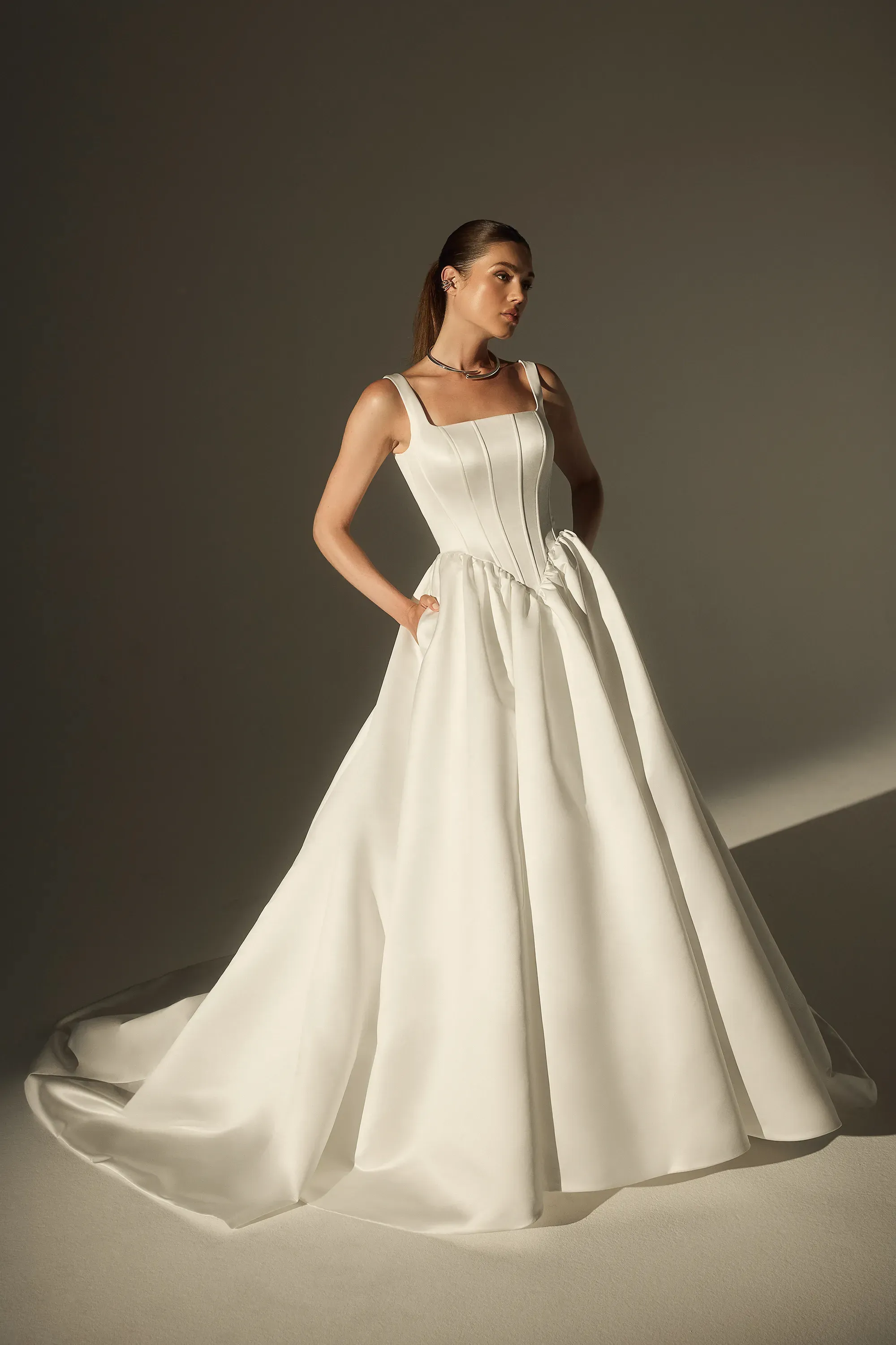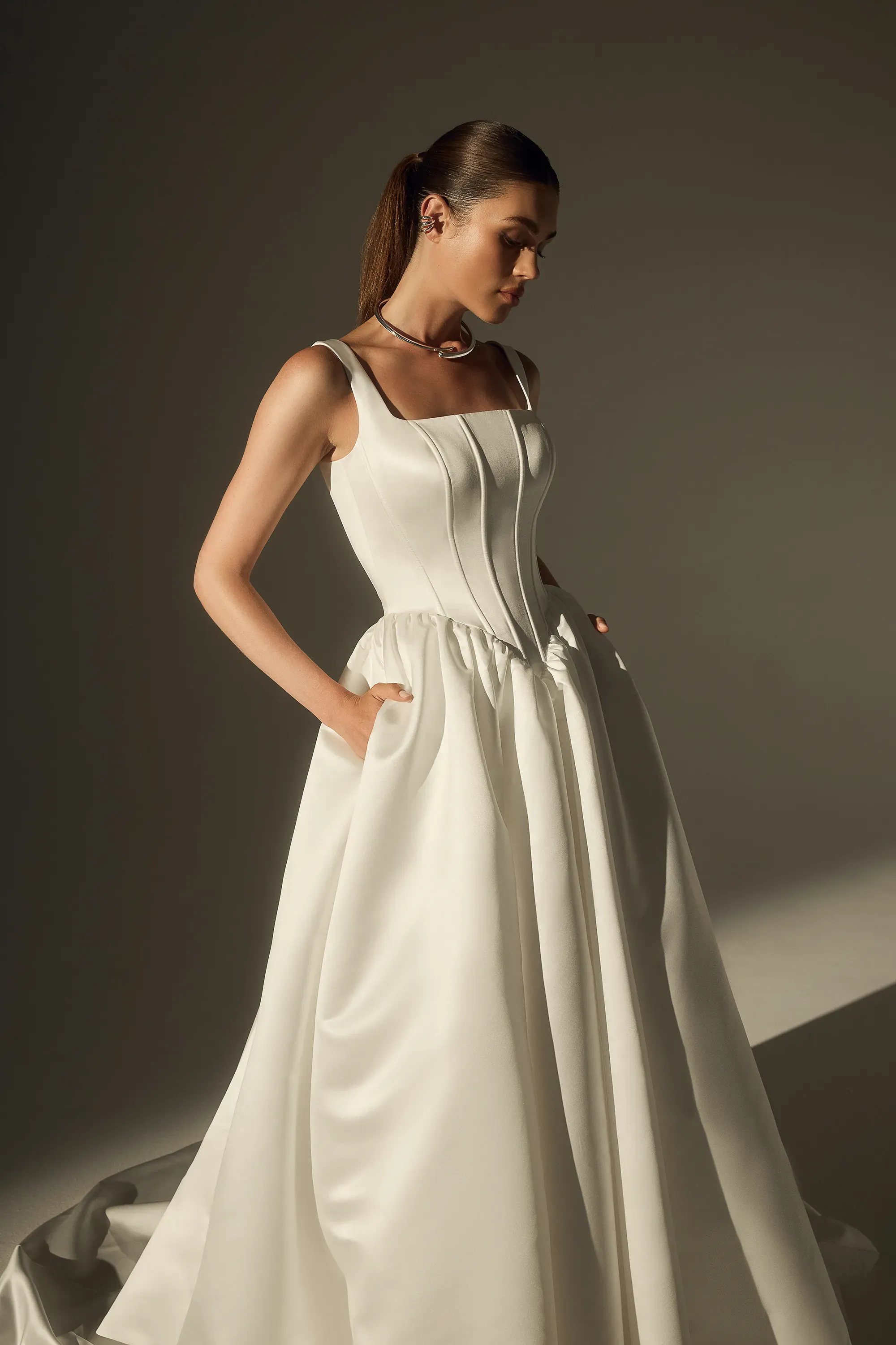 LE170-1 Jaina is an architectural A-line gown that masterfully blends modern minimalism with romantic grandeur. A crisp square neckline and wide tank straps frame the shoulders with clean elegance, while exposed corset boning and a sculpted Basque waistline create a flattering, elongated silhouette. Crafted from sleek satin, the full skirt flows effortlessly into a dramatic 78-inch cathedral train, offering movement and majesty with every step. Hidden pockets add a contemporary, functional twist to this regal design, making it as practical as it is refined. Finished with a center back zip closure, LE170-1 is perfect for the bride who values timeless design, structural beauty, and quiet sophistication—whether paired with minimalist accessories or a bold veil to highlight its clean lines.