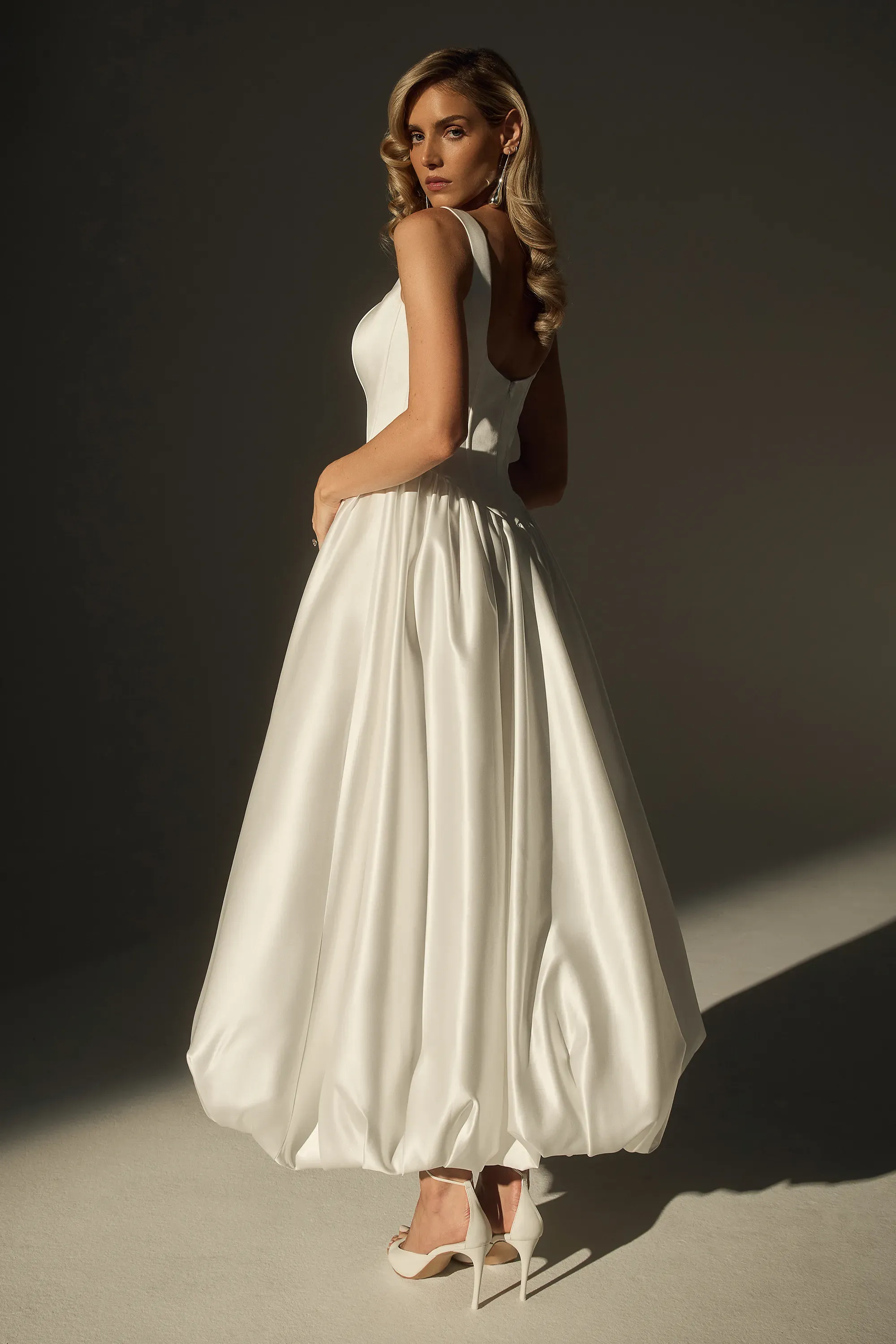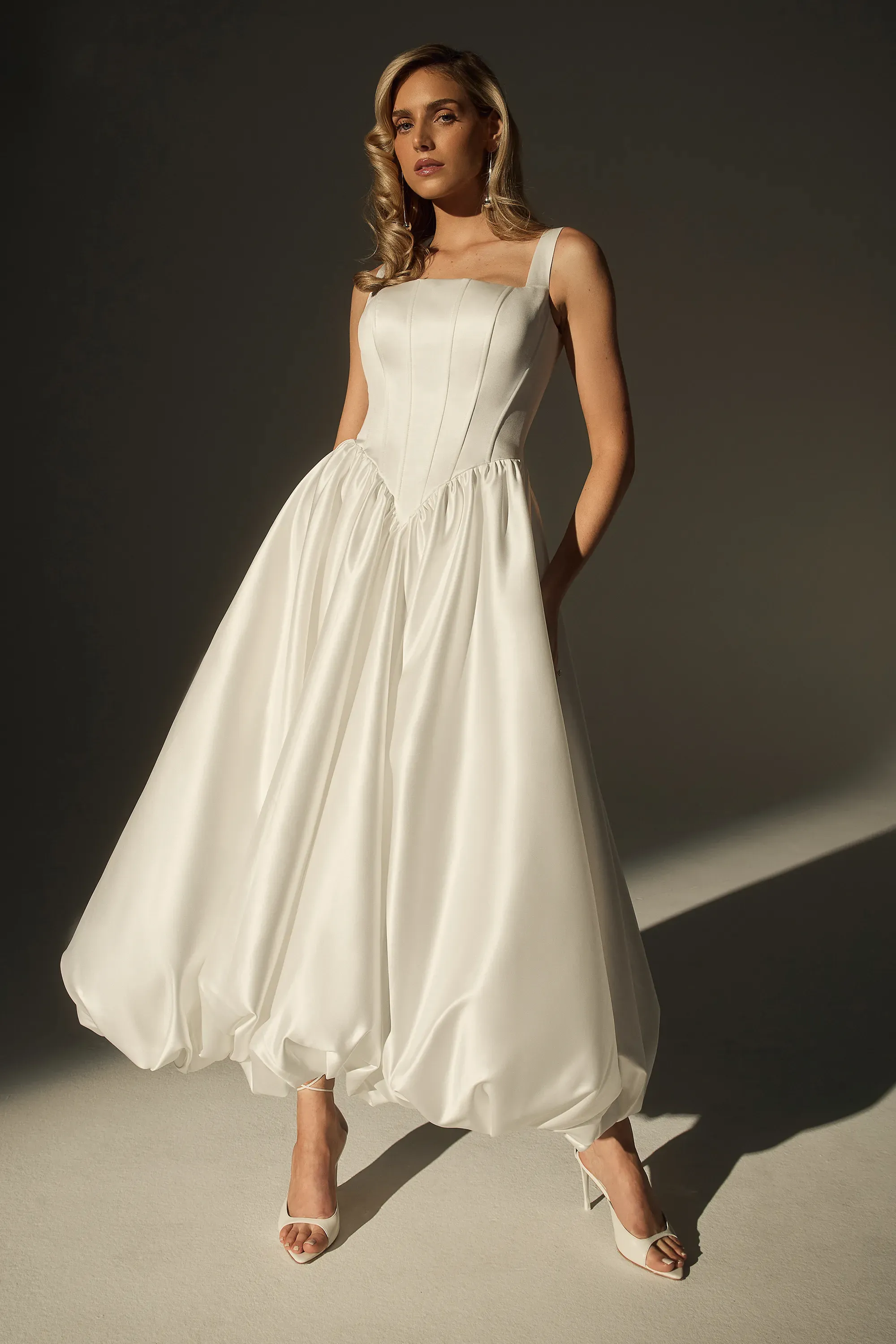 There’s something unforgettable about LE171-2, a modern A-line gown that blends timeless elegance with sculptural sophistication. Crafted from sleek perfecting satin, its refined silhouette features a classic natural waistline for a traditional touch, while the asymmetrical one-shoulder neckline and ruched bodice introduce soft movement and architectural drama. A bold satin rose blooms at the bodice, creating a romantic focal point that draws the eye from every angle. Graceful yet daring, LE171-2 is designed for the bride who wants to embody effortless beauty with a fashion-forward edge, perfectly complemented by satin gloves or a sleek veil for an added touch of contemporary romance.