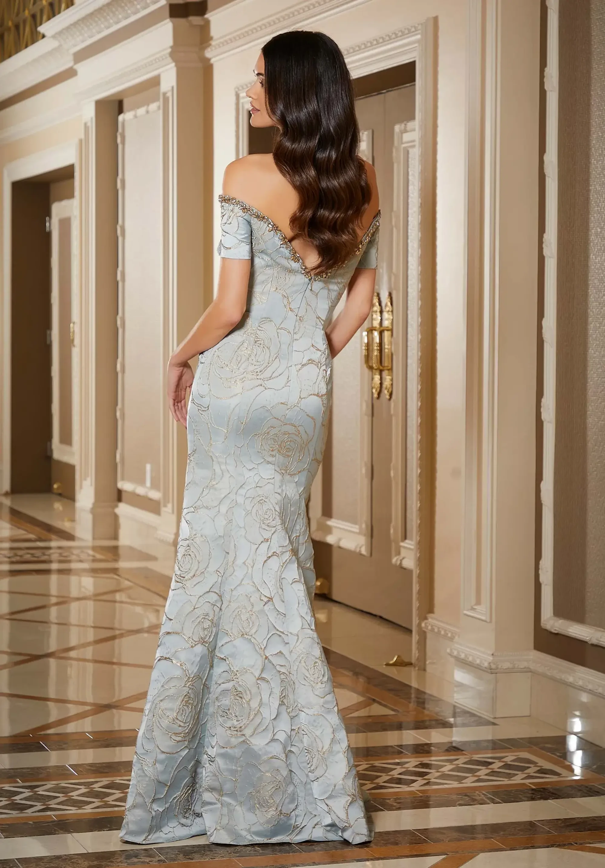 Elegant evening gown in brocade features an abstract floral pattern with a lovely off-the-shoulder, sweetheart neckline adorned in jeweled beading on a fit and flare silhouette.