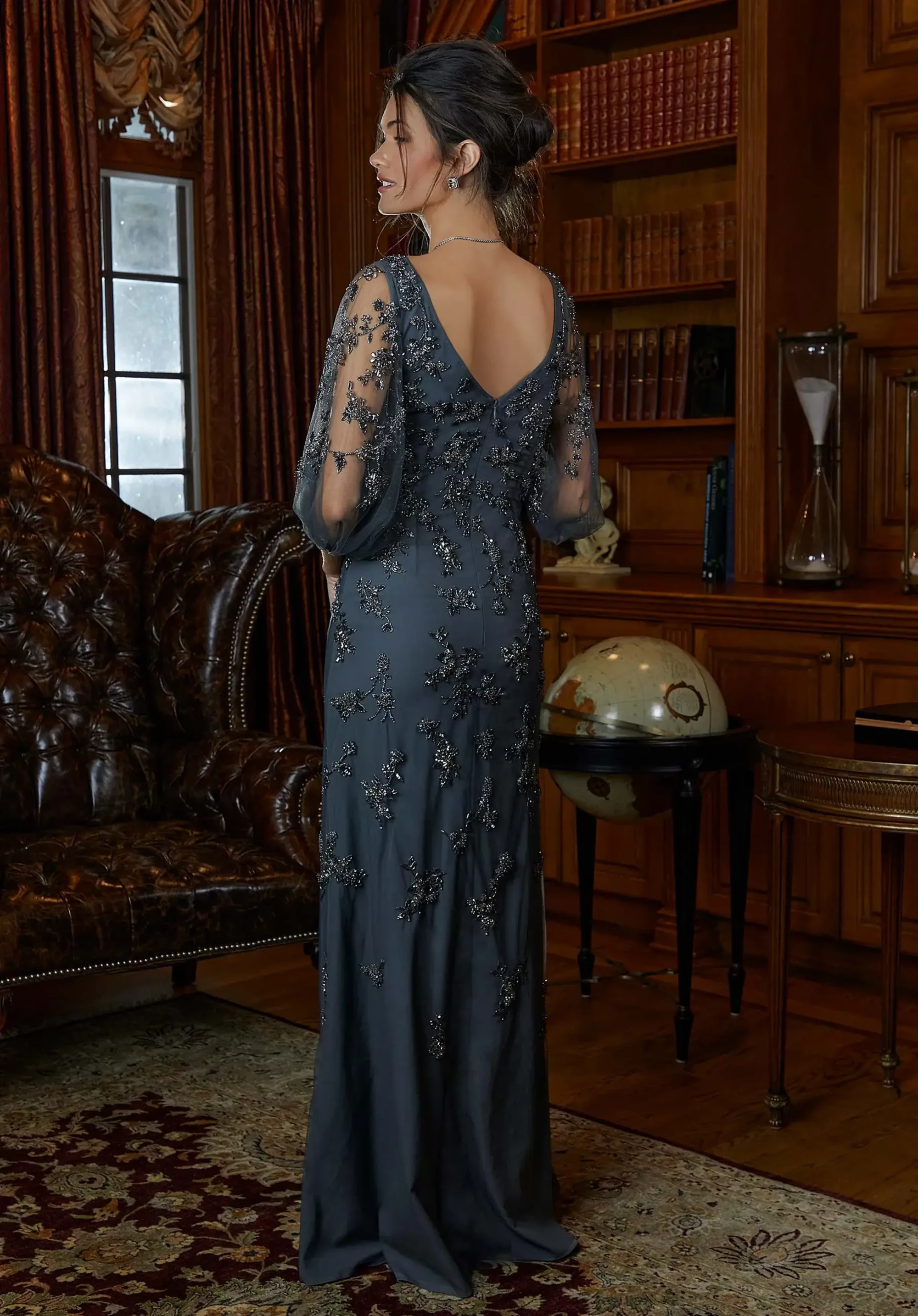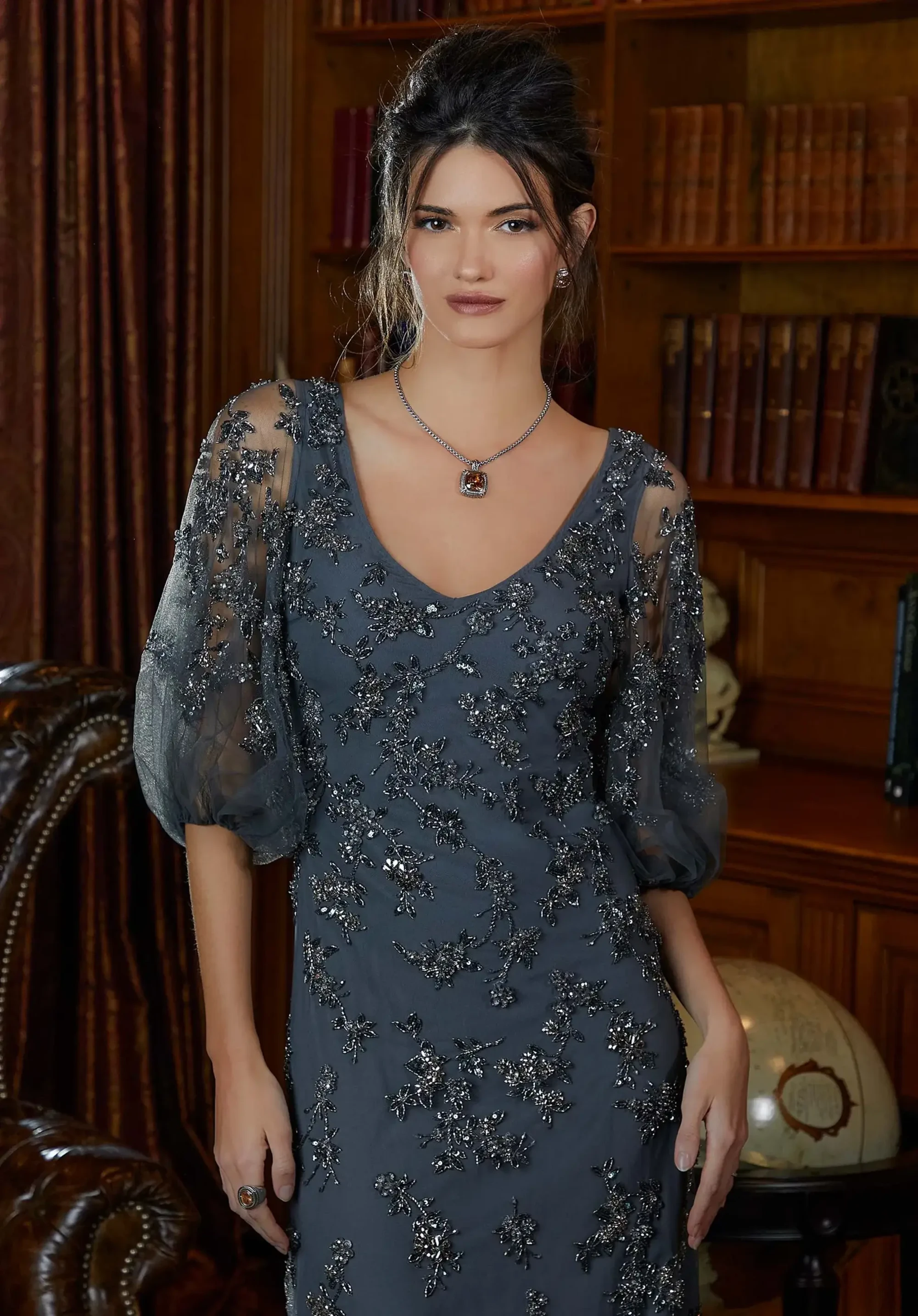 Graceful evening gown has a slim A-line silhouette featuring a botanical-inspired allover beaded design from the sheer elbow-length pouf sleeves to the subtle skirt slit.