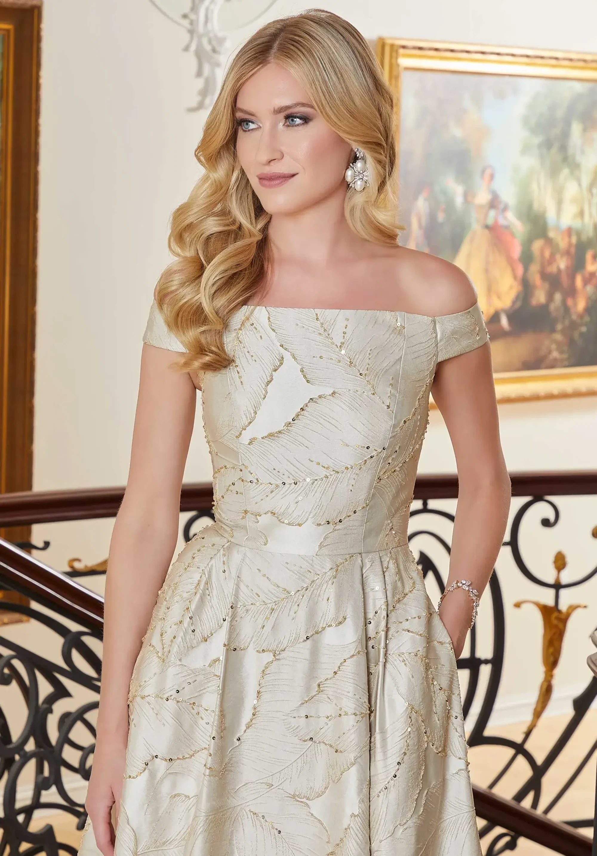 Sophisticated evening gown is luxe brocade fabric designed with a chic feather pattern adorned in sequins for a sparkling effect. The straight, off-the-shoulder neckline is a modern touch to the classic A-line silhouette.