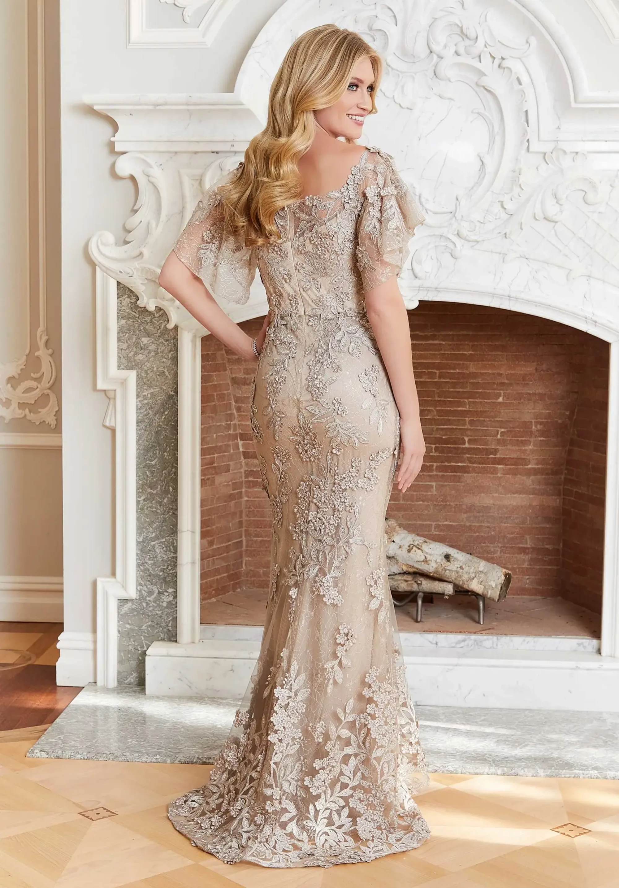 Chic evening gown features square neckline and flirty flutter sleeves on a romantic Chantilly lace fit and flare designed with dazzling crystal beaded, botanical-inspired embroidered appliqués.